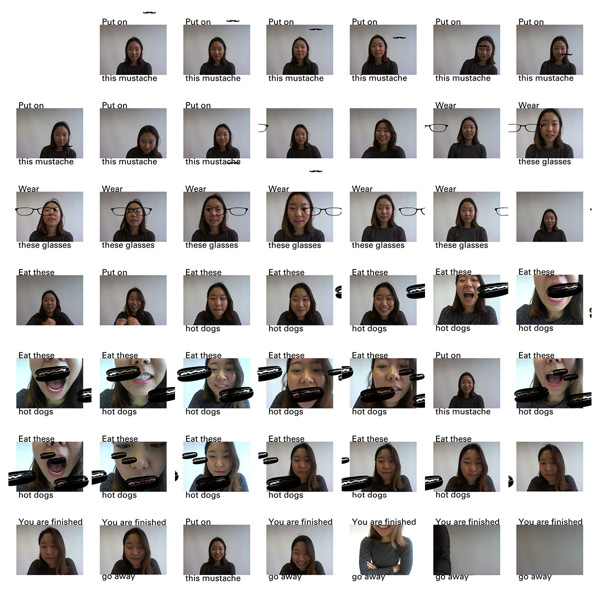 Using Processing I created a program that had subjects follow instructions such as, "Put on this mustache", and interact with the graphics that are animating across the screen. My program would then take two photos of the subject every second. One with the graphics they are responding to and one without. I am interested in the way we interact with technology and by examining the photos taken by this program we can get a glimpse of what our computer sees when it looks at us.